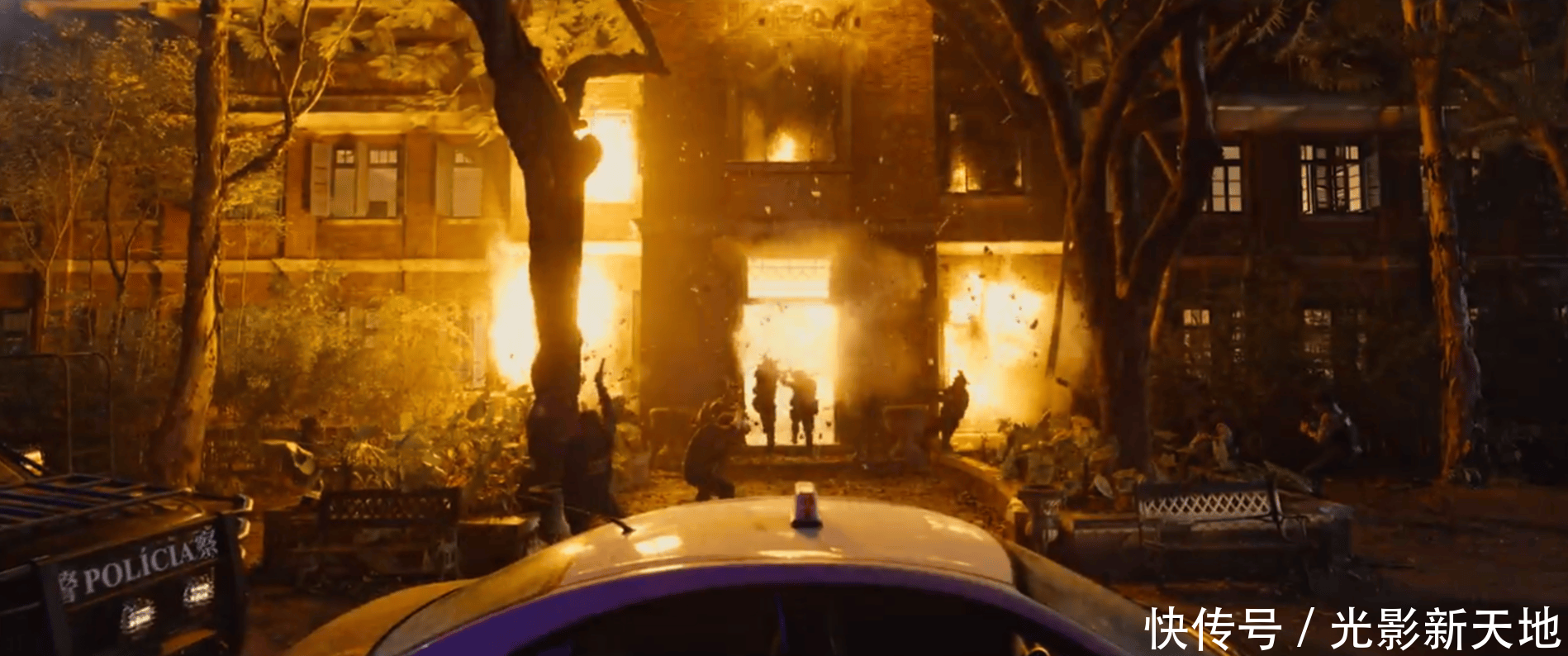 电影中和血战孤儿院平行推进的,是装备精良的武装分子冲进总部,计划干掉成龙饰演的黄德忠,养子团则假扮警察趁乱通过断电打开保险库,偷走虚拟货币。
