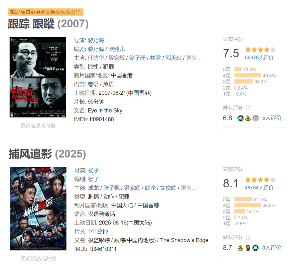 由于点映较长,《捕风追影》上映首日豆瓣开分8.1,这部电影翻拍自2007年遗憾未能内地上映的香港电影《跟踪》,原版是杜琪峰银河映像出品的电影,游乃海编剧、导演,豆瓣评分7.5。在《捕风追影》之前火牛网,韩国翻拍了一版,豆瓣评分7.7。