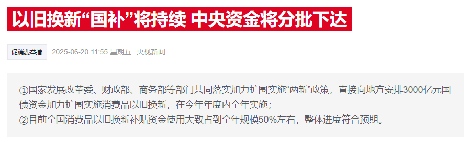 之前有传闻国补退坡了,但今天财联社报道,消费品以旧换新加力扩围政策没有变化,补贴资金使用进度符合预期,第三、四季度中央资金将陆续下达。