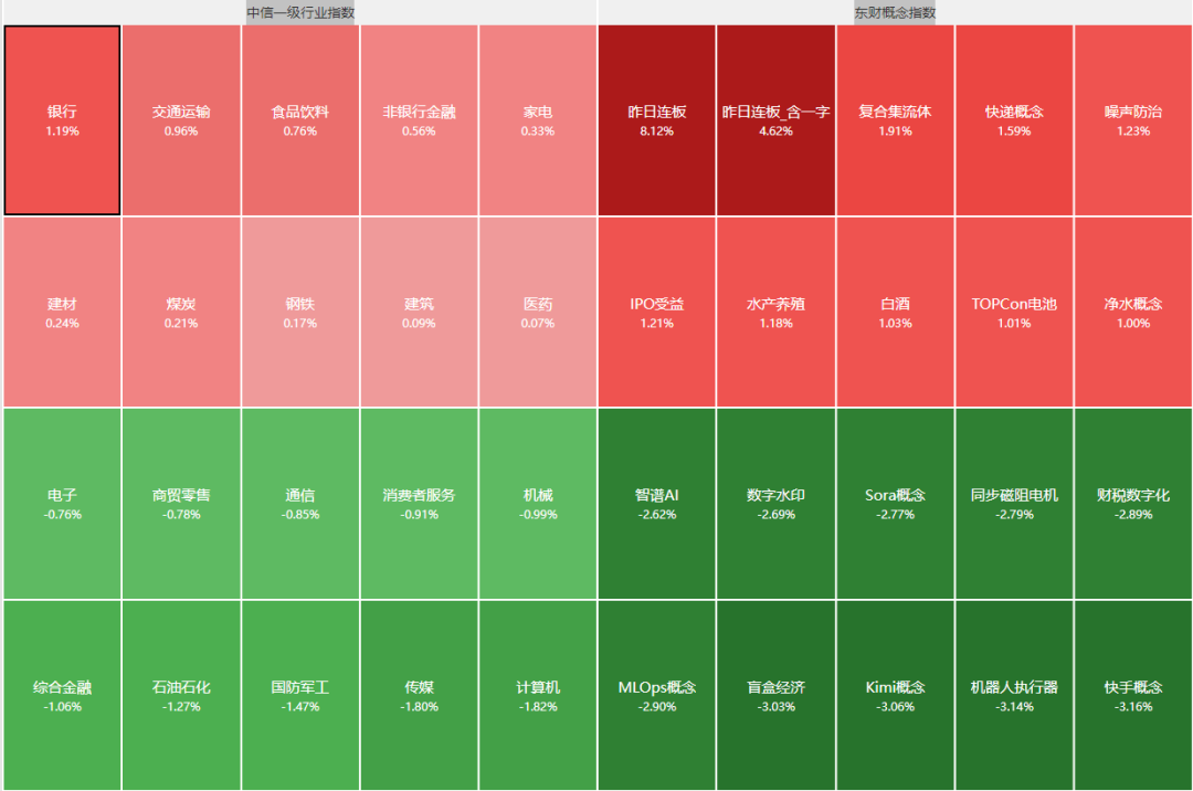 分行业来看,银行、交通运输、食品饮料、非银金融、家电等行业领涨,计算机、传媒、国防军工、石油石化等行业领跌。