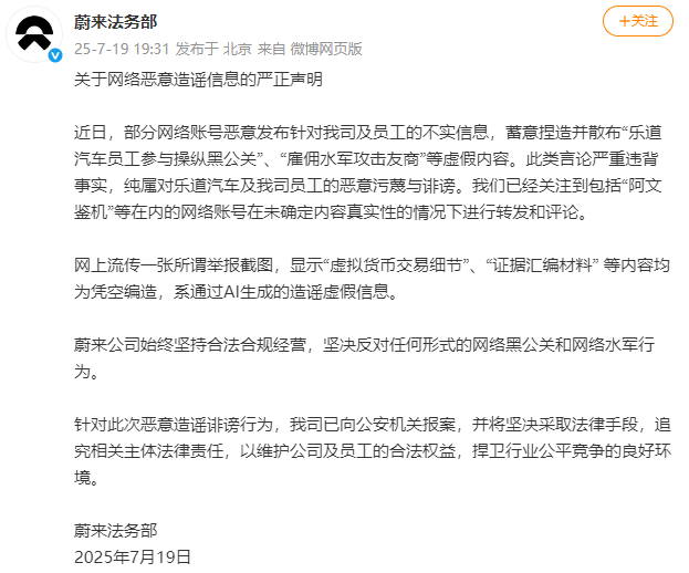 蔚来法务部:有网络账号恶意发布针对公司及员工的不实信息 公司已向公安机关报案信康优配蔚来法务部:有网络账号恶意发布针对公司及员工的不实信息 公司已向公安机关报案